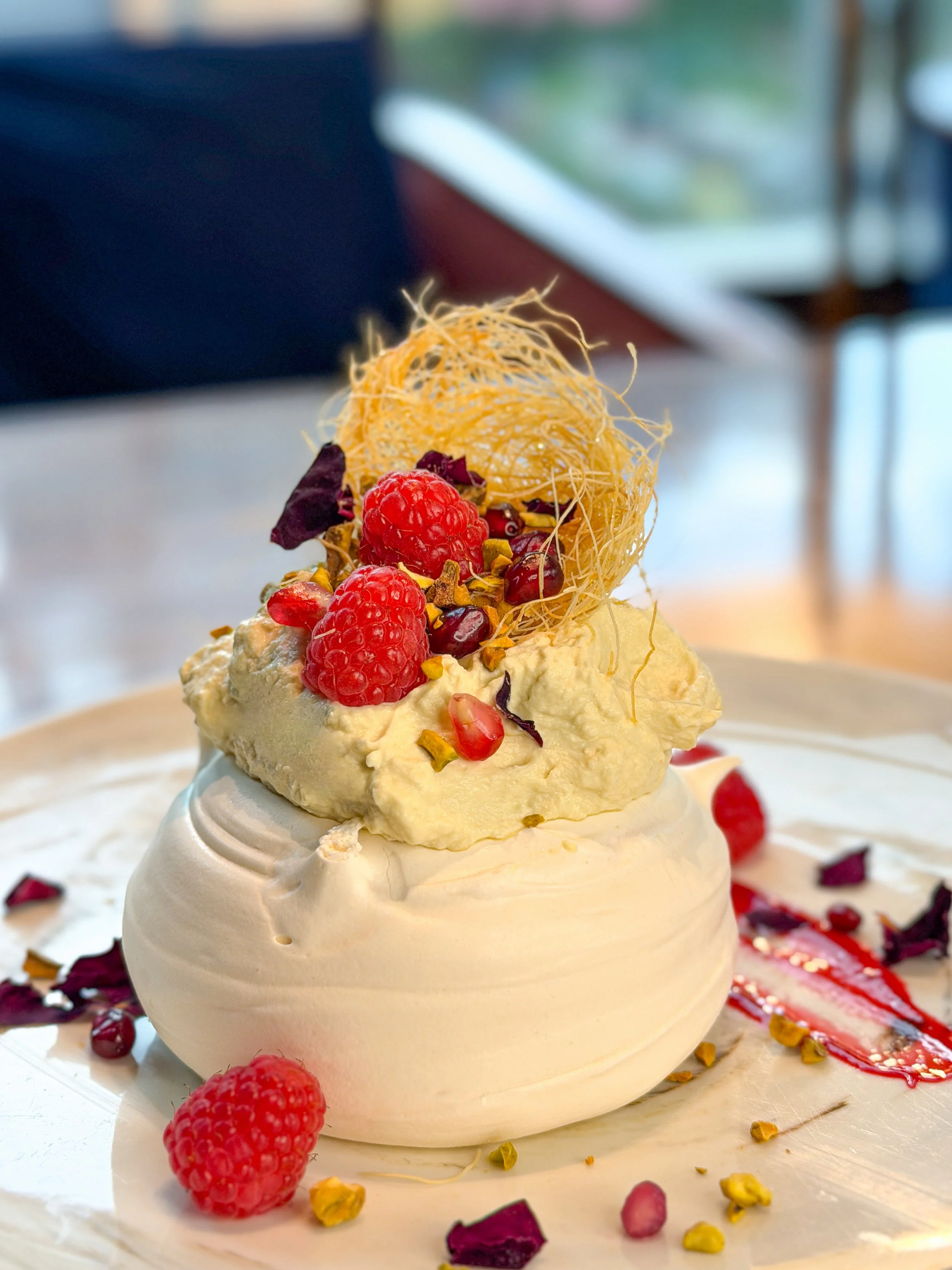 End on a beautiful note with Velvet Rose, our signature pavlova with pistachio mascarpone cream, raspberry sauce, raspberries, rose petals, and pistachio. As lovely to look at as it is to share.