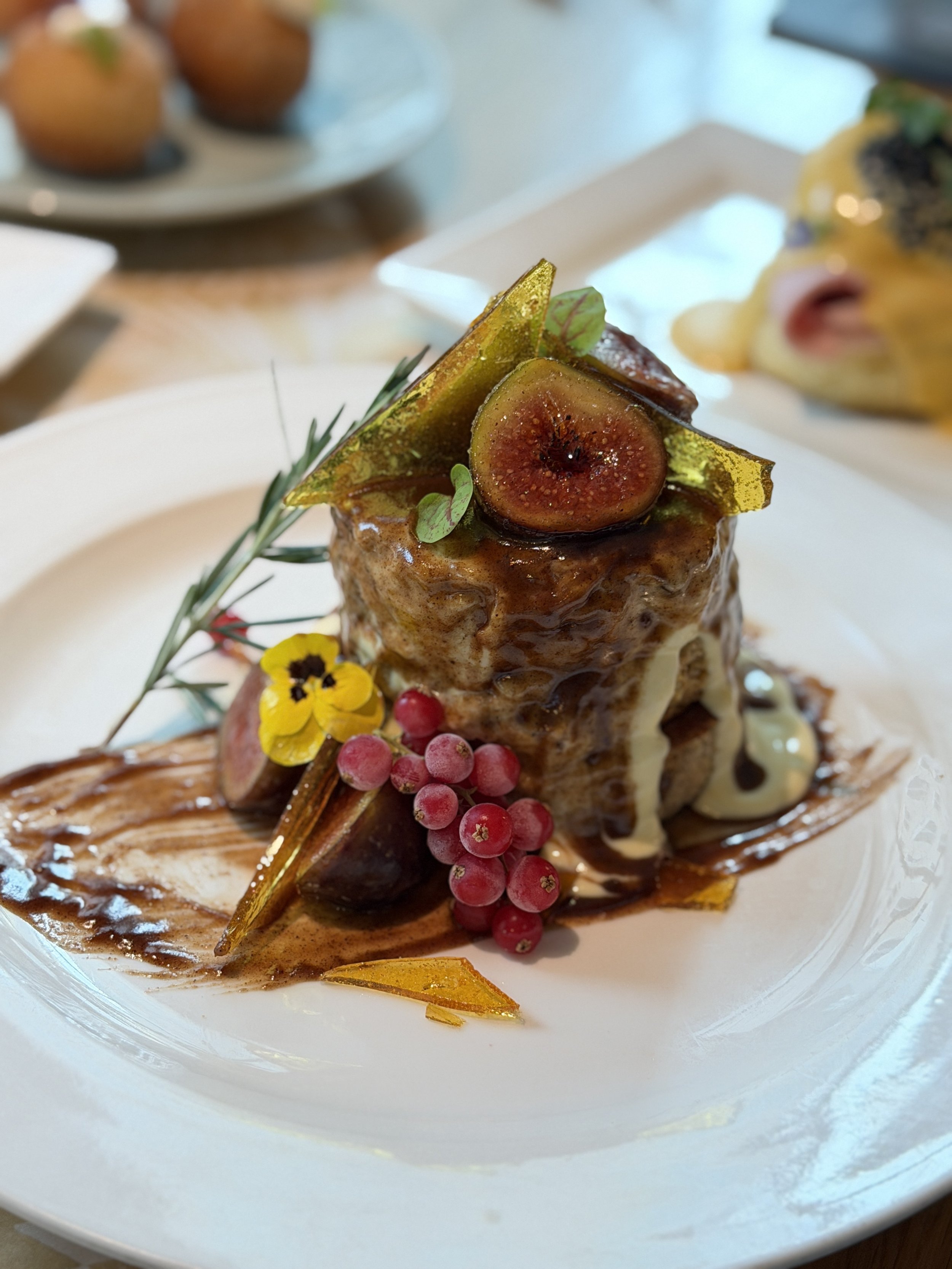 Before the mains arrive, the table begins to fill with small, joyful bites, the kind that spark conversation and smiles. Mini Eggnog Doughnuts, filled with eggnog cream and strawberry jam and rolled in cinnamon sugar, taste like childhood memories made grown-up. Gougeres appear warm and delicate, with smoked trout, crème fraîche, and a shimmering spoon of black caviar — a little festive luxury in just one bite. For something wholesome yet elegant, the Christmas Granola brings together whipped maple yoghurt, fig compote, brûléed figs, and seasonal fruit, a bowl of comfort designed to slow down the morning.